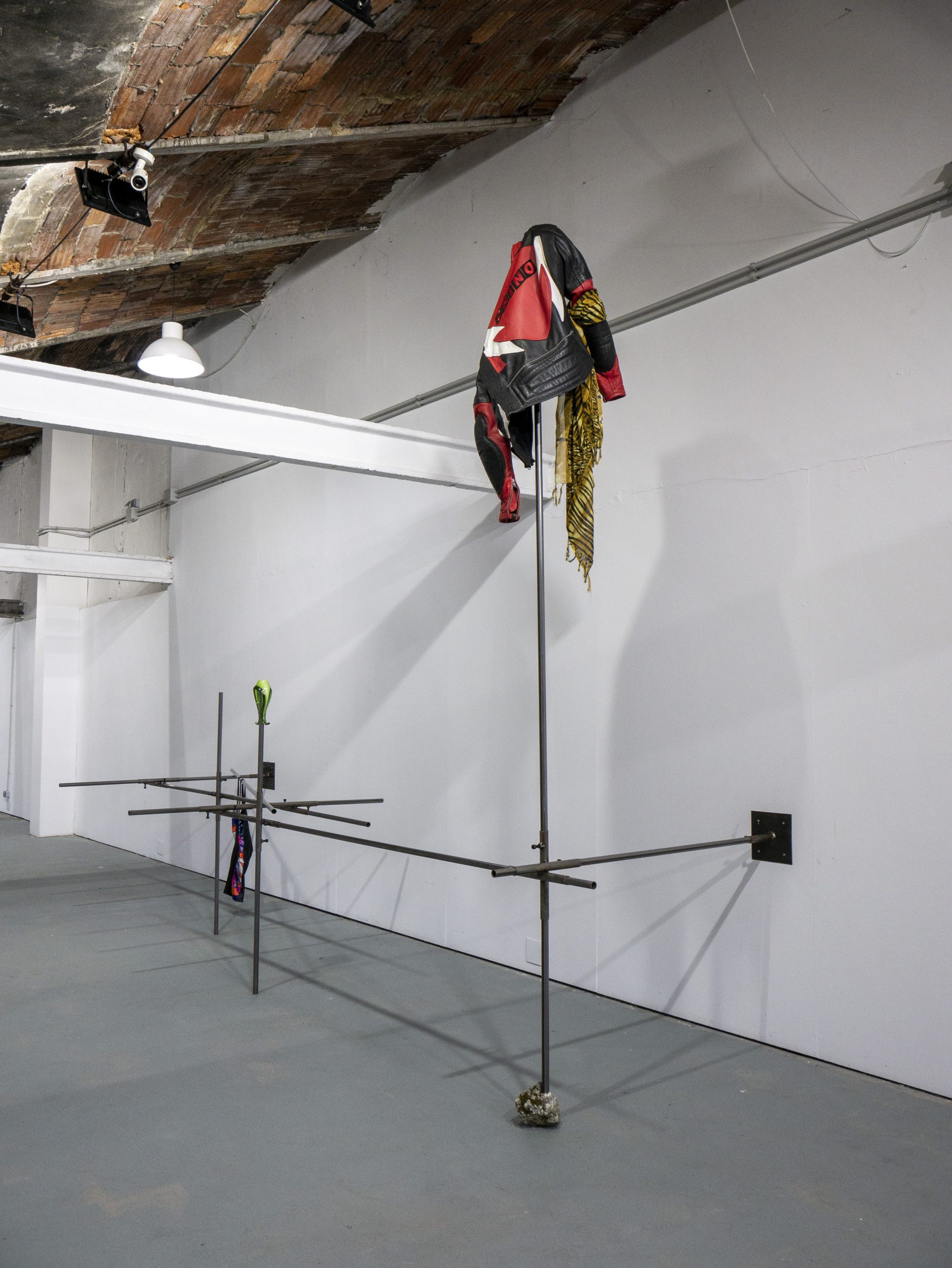 La exposición consta de seis tipos de obras, el primero es una estructura de gran tamaño en acero tubular que se une de forma telescópica, como creciendo a partir de los nudos de un árbol. La segunda atiende a una relación espacial directa al estar atadas o unidas al espacio de la galería como si de un Noray (elementos o postes sobre los que se asegura una embarcación en un puerto) se tratara, son elementos más discretos que aparecen dispuestos como relieves colgantes. En el tercer grupo hay una serie de objetos articulados entre una estructura geométrica y botes de bebida energética. Son las obras que establecen una relación más transparente entre los procedimientos y las intuiciones, que no explican nada, pero exponen lo que está puesto en juego. El cuarto grupo son una serie de obras que involucran objetos punzantes. Apelan de alguna forma a la melancolía, utilizan algo funcional sometido a un sentido estructural, como de prótesis de insectos, como algo que les falta. A continuación hay dos obras donde se unen objetos provenientes de la escalada, objetos que dan un nexo corporal, atienden casi a una idea de fetiche o bondage. Y por último un vídeo en el que el bailarín Angel Zotes con quien colaboré en el proyecto realiza diferentes acciones en varios espacios.