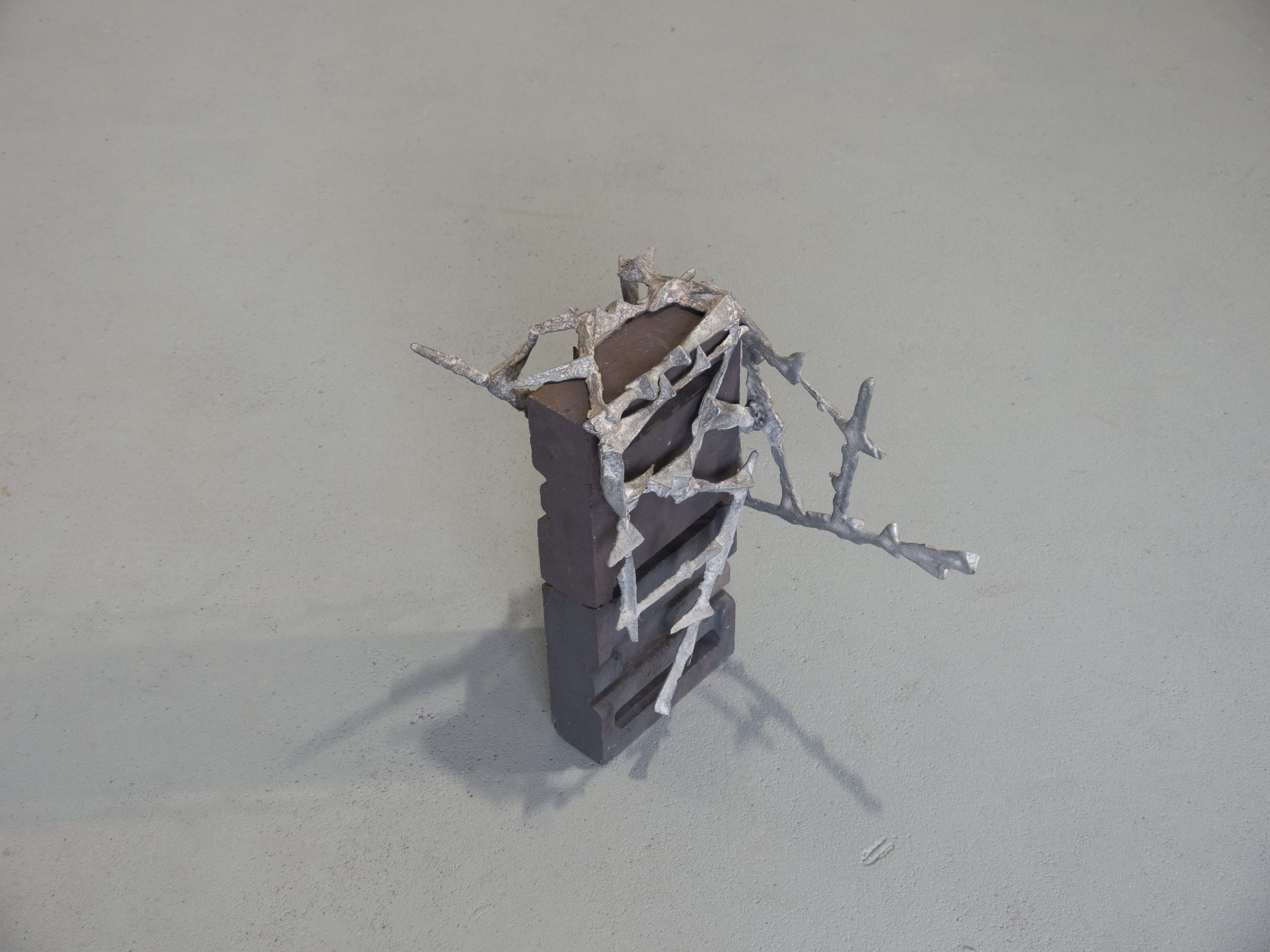 Hay formas que crecen como una planta en una maceta, precisan de cierta atención, sus raíces se ocultan y adaptan al recipiente absorbiendo los nutrientes, mientras que otra parte se mueve hacia la luz. Trato de desarrollar mis piezas a modo de injertos, como una técnica artesanal en la que una porción de tejido procedente de una planta se une a otra ya asentada de modo que ambas crezcan como un único organismo. Materialidades dispares que se acercan unas a otras, modificando las distancias como en un juego de encuentro y seducción.